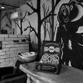 Оригинальное оформление заведения — результат творческой работы крупных дизайнеров. Стены украшены ручной росписью молодых перспективных художников Беларуси. Необычная атмосфера создана при помощи грамотного цветового сочетания и оригинальных элементов декора. В центре просторного светлого помещения — бильярдный стол. Зал полностью оборудован: мягкие диваны, удобные кресла, современные парикмахерские принадлежности известных марок.